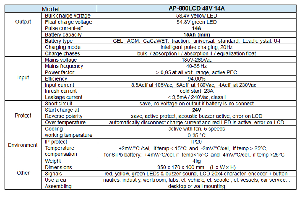 - Battery charger AP-800LCD is suitable for charging only 48V lead (Pb) batteries from all together capacity of min. 14Ah. Maximum capacity of charged battery is not limited. Battery charger AP-800LCD is for (we recommend that the charging time is not too long) battery systems up to 1000Ah total capacity..